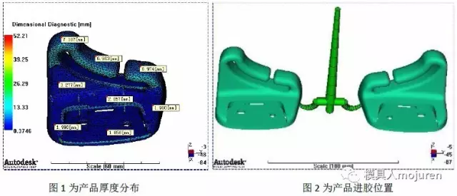 此產品為汽車安全帶固定件: 產品最大外形尺(chǐ)寸(cùn):70*45*63,產品平均肉厚:1.8~7.0mm,產品肉厚差異較大,因此采(cǎi)用3D網格分析,如圖1所示。材料:ABS+PA6-GF8 Terblend N NG-02 : BASF .此材料已做修正,質量指示器為銀級,此(cǐ)材料可信度較高。 模具為一模兩件,由於(yú)產(chǎn)品(pǐn)量大(dà),因此進膠方(fāng)式為冷流道隧道澆口進膠,如圖2所示。