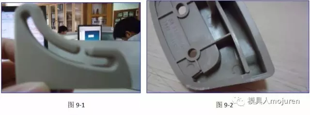 在這裏製品仍做了1.2MM的反變形,澆口(kǒu)由原來(lái)的牛角進(jìn)膠改為現在的大(dà)水口搭底進膠,分流道改(gǎi)為了S形(xíng),可防止主流道及分流道 的冷料(liào)進入模腔。實際的試模產品如圖(tú)9-1、9-2所示,產品無變形